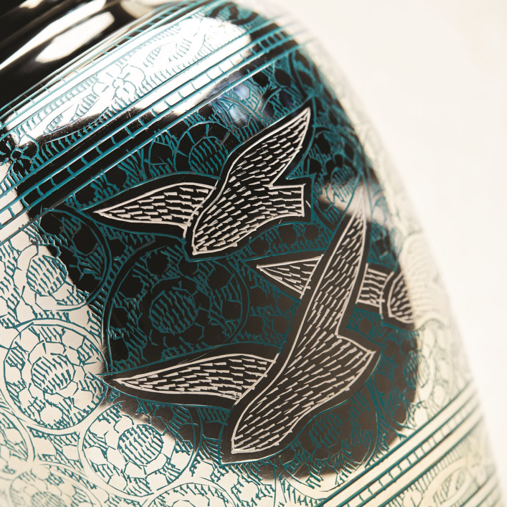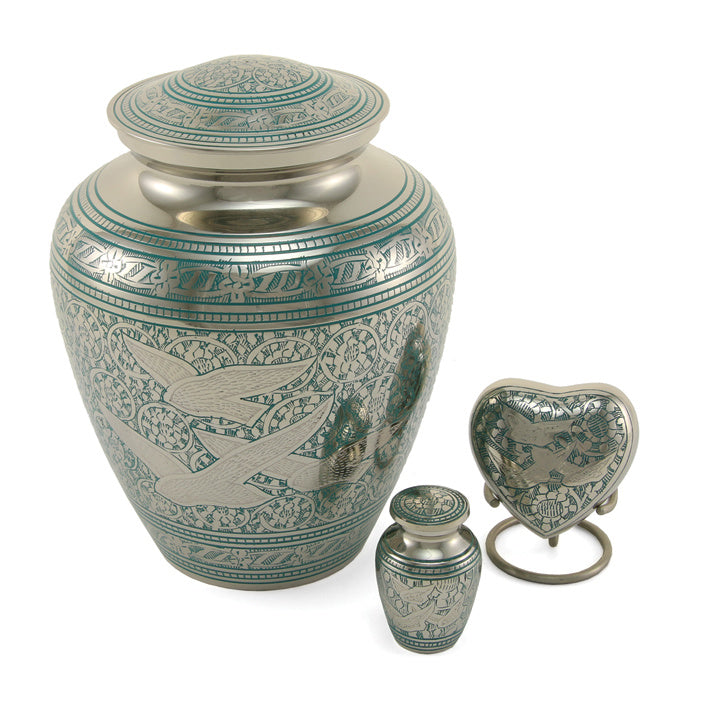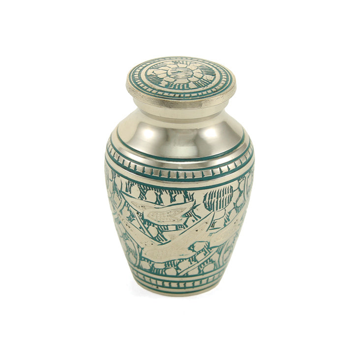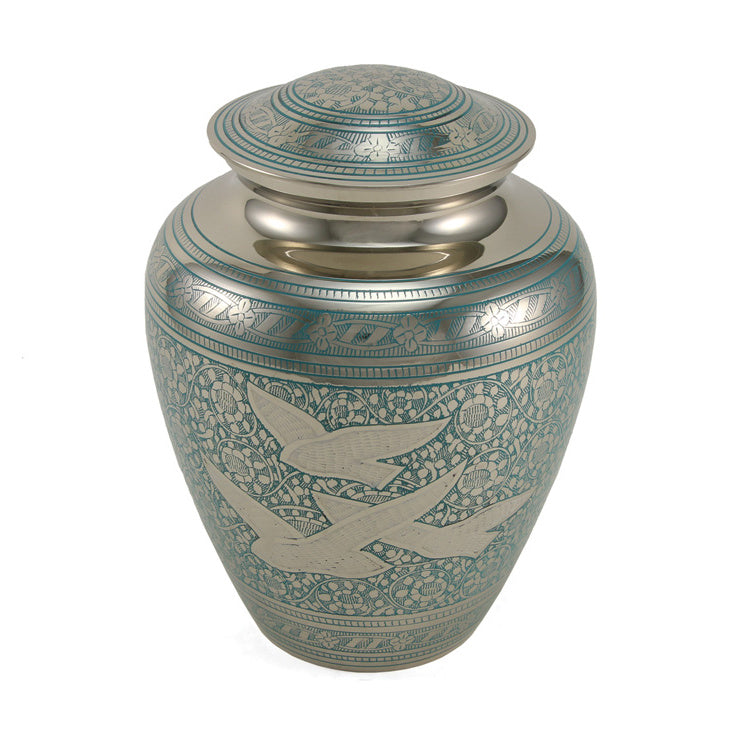 Majestic birds are often considered a link between Heaven and earth. Celebrate your loved one’s eternal life with this brass cremation urn from our Elite Going Home Collection. Hand-engraved with a contrasting bird design on a polished nickel-plated finish.